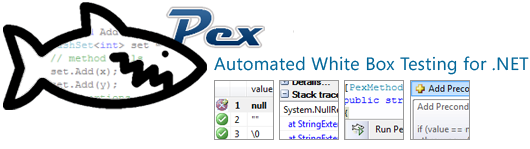 Pex (Program EXploration) produces a traditional unit test suite with high code coverage. A parameterized unit test is simply a method that takes parameters, calls the code under test, and states assertions. Given a parameterized unit test written in a .NET language, Pex automatically produces a small unit test suite with high code and assertion coverage. To do so, Pex performs a systematic white box program analysis.