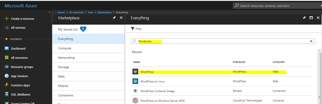 Step 3: Search for “Wordpress” among resources and Select WordPress