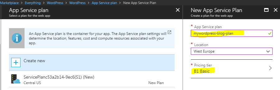 As metioned in the spoiler we will go with a B1 Basic tier in West Europe location.