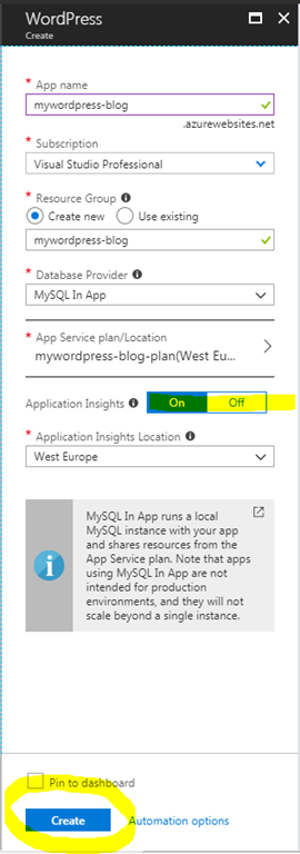 Step 8: Turn Application Insights ON and Specify location (This is optional, you do not want Application Insights performance logging for your blog, you can simply ignore)
