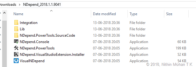 Once you obtained license you will able to download NDepend_2018.1.1.9041.zip, is latest version available while I write this article. Extract the zip file into your local folder, you could see the different packages/executables within the package.