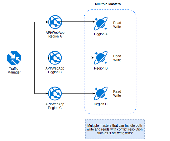 Azure Cosmos DB multi-master configuration is the game changes that really makes it a true global scale database with automatic conflict resolution capabilities for data synchronization and consistancy.